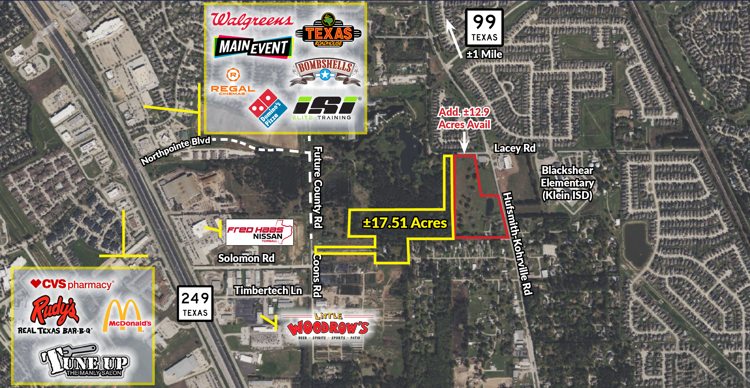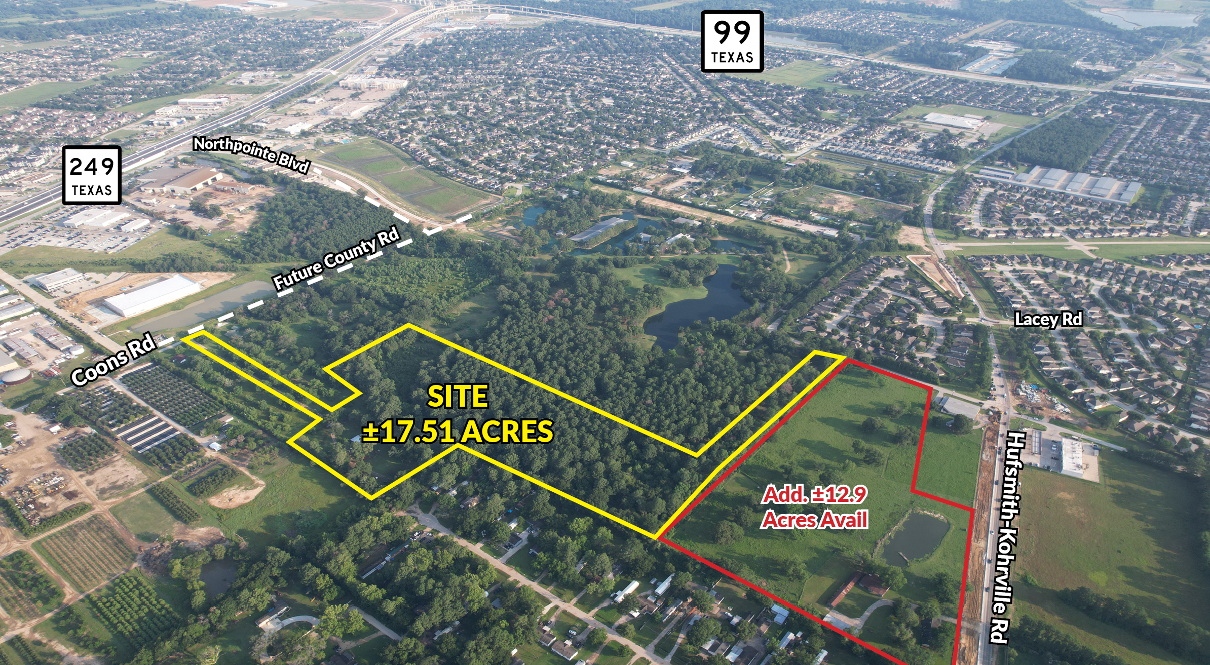 This exceptional 17.51-acre tract of land presents a strategic investment opportunity, ideal for multi-family, industrial, or storage development. The future county road set to connect Coons Road to Northpointe Boulevard will enhance access and connectivity, adding significant value to the property. Situated less than one mile from both Highway 249 and the Grand Parkway, this parcel offers unparalleled convenience and accessibility for logistics and commuting. Additionally, an adjacent 12.9-acre parcel is also available, providing further expansion potential. This location promises robust growth prospects and flexibility for diverse development projects.