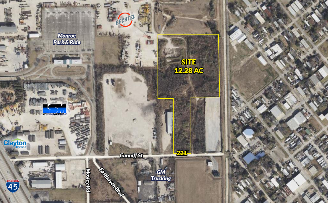 ±12.28 acres of industrial land available for sale or lease in a prime Southeast Houston location. Situated at 9307 Canniff Street, the site offers approximately 221 feet of frontage along Canniff St and is ideally positioned for industrial outdoor storage (IOS), laydown yard, trucking, or contractor yard use