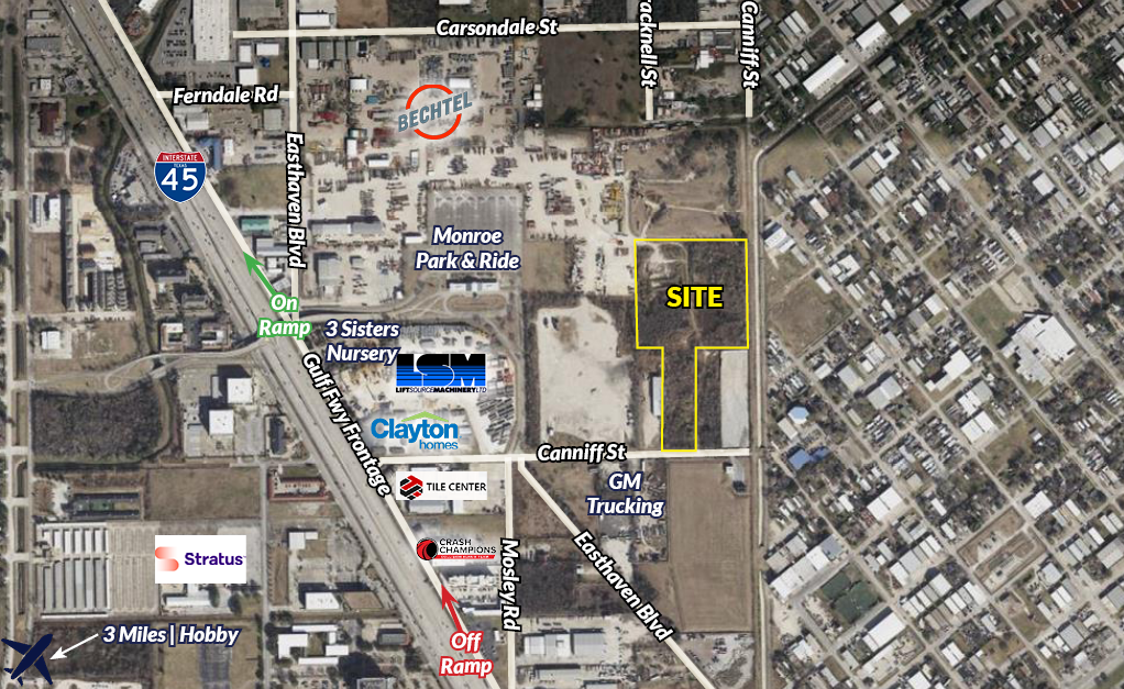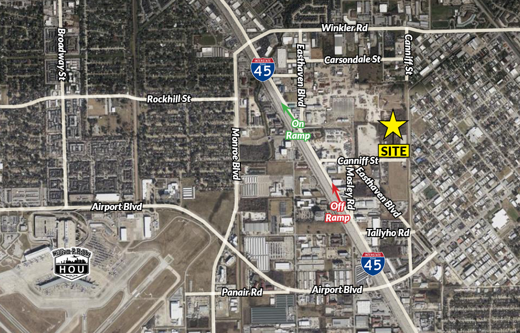 This property provides exceptional access to major transportation corridors, including immediate connectivity to I-45 via nearby on/off ramps. The site is strategically located approximately 3 miles from Hobby Airport, 10 miles from Downtown Houston, and 11 miles from Greens Port, making it well-suited for logistics, distribution, and port-related operations